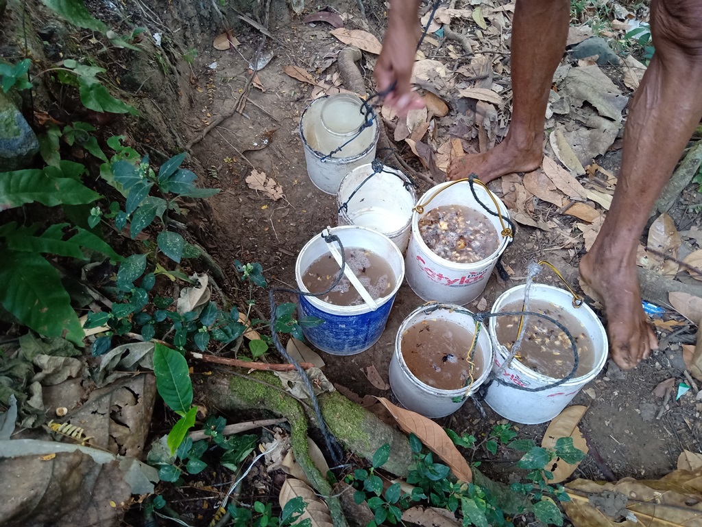 Pak Sardi menampung nira di wadah ember bekas cat – obyek ekonomi desa Bigaran