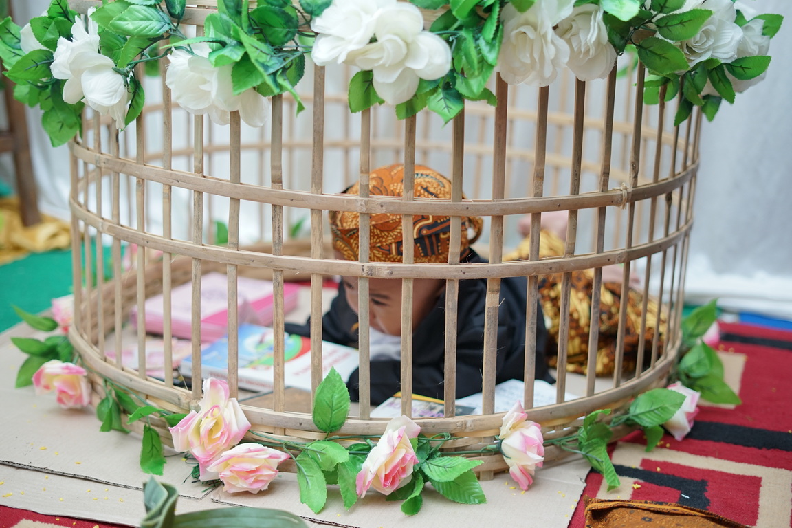 Jadi, kalau ngedun-dunke itu ada ayam yang nantinya dibeirkan ke dukun bayi yang mendoakan. Jika ayam tersebut kelak manak di tempat dukunnya, berarti nanti rezeki si anak akan melimpah,” jelas Ibu Yani. Lalu si anak tersebut dijagongke di jadah yang diletakkan di sebuah wadah dari anyaman bambu supaya ketika nanti mencari rezeki, bisa kraket layaknya jadah dan tidak boros. Saat menginjak jadah, sambil dibacakan seolawat Nabi. “Kuwi supaya tekane gedhe bisa ngaji, bekti karo wong tuwa,” imbuhnya.