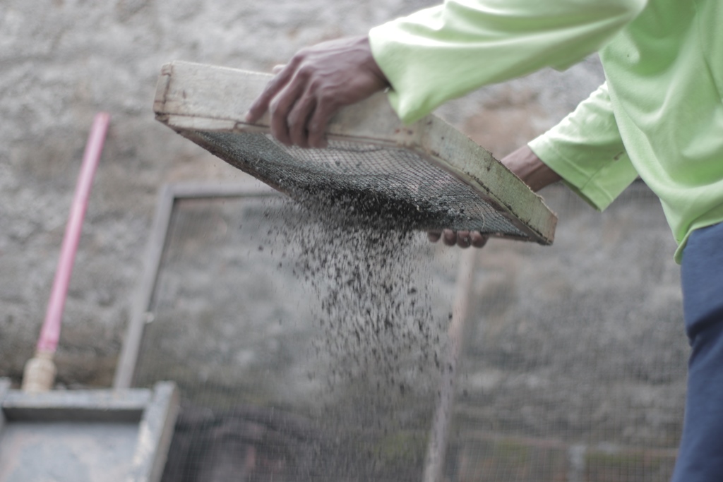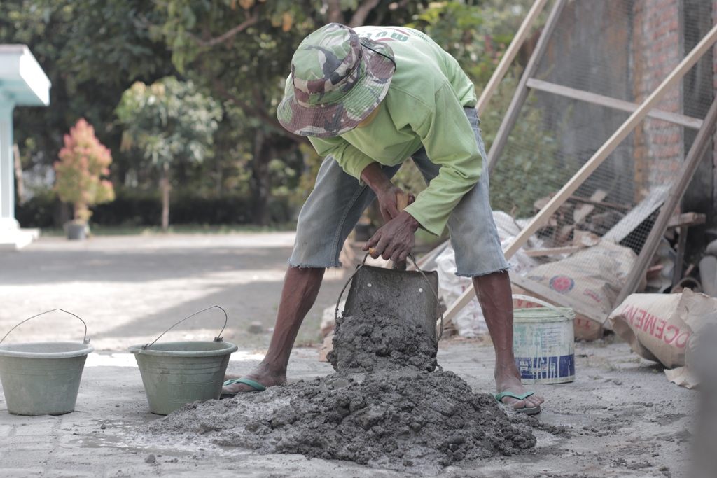 Ngaduk. Maksud ngaduk di sini mencampur bahan seperti semen, pasir dan gamping dan air. Alat yang digunakan untuk mengaduk adalah cangkul. Hasil adukan nanti akan digunakan untuk merekatkan batu atau batu bata dalam bangunan rumah. Kegiatan ini dilakukan gotong royong bersama dan saling mengisi untuk kebutuhan ngaduk bahan-bahan tadi. Namun sebelum ngaduk, terlebih dahulu ngayak pasir. Ngayak pasir adalah proses memisahkan antara kerikil dengan pasir halus. Setelahnya, pasir halus siap diaduk. Perlunya ngayak adalah karena campuran pasir halus lebih rekat dan kokoh daripada kerikil. Maka ngayak menjadi sangat penting agar nanti bangunannya kokoh.
