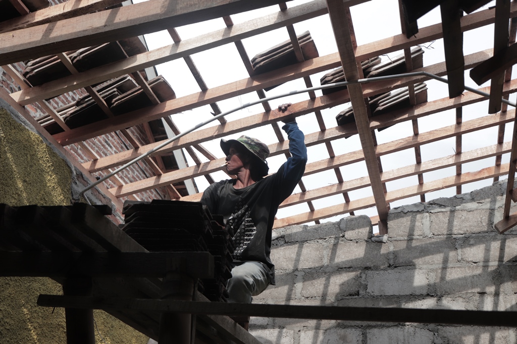 Saat bentuk bangunan sudah selesai. Langkah selanjutnya adalah pemasangan kerangka atap sampai nggendhengi. Dalam rangkaian proses pemasangan ini dibutuhkan banyak orang, karena harus mengoper rangka yang berat dari bawah ke bagian atap. Nantinya setelah rangka berada di atas langsung diletakkan pada tempat yang sudah dibuat. Kemudian dilanjut ngerengi. Ngerengi adalah proses membuat penyangga untuk gendheng atau genting. Dibutuhkan ahli bangunan seperti Pak Kohar untuk memperhitungkan jarak dan ukuran penyangga tersebut. Setelah selesai diukur, warga saling mengisi mengoper reng, malu di beberapa tempat di bagian atap. Gotong royong ini sangat meringankan tuan rumah karena pekerjaannya menjadi lebih cepat selesai.